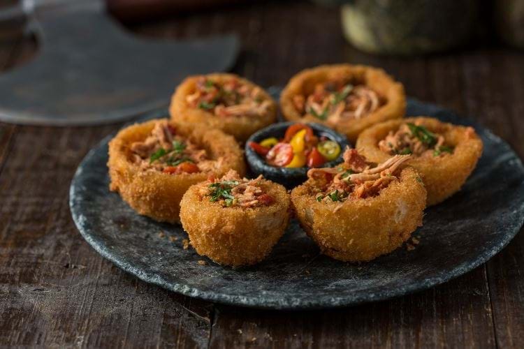 Sim, há alguns pratos do período medieval que são servidos na Taverna, entre eles: o Apple Bacon. É um refogado rústico de maçã, cebola e bacon que acompanha uma baguete fatiada – R$32,00. Agridoce no paladar na medida certa. Ou enquanto se escolhe as bebidas ou melhor dizer – poções mágicas para beber, peça as Azeitonas empanadas de Sherwood, que são crocantes e macias – R$16,00. Mas não saia da Taverna sem pedir pelas Cebolas de Tão Tão Distante. São cebolas empanadas e recheadas com pernil desfiado e temperado com relish de pimentão defumado. De fritura bem feita, o petisco medieval é crocante, sequinho e supersaboroso. É um dos pontos altos da casa. R$36,00.