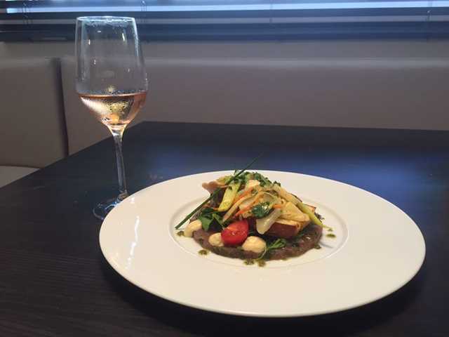 Depois, já harmonizando com o Rosé Miraval da Côtes de Provence – (marca de vinho cujo os proprietários são os atores Angelina Joulie e Brad Pitt), Um atum com vegetais salteados em molho cítrico – incrível.