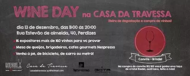 O dia 13 de dezembro das 11h às 20h – promete boas experiências e acima de tudo muito sabor na Casa da Travessa. Trata-se de um espaço charmoso no bairro de Perdizes, destinado a cursos, degustações, lançamentos, eventos e exposições. Para isso, o wine Day chega para fazer as honras da nova casa com uma feira com mais de 160 vinhos para provar – onde é possível tirar qualquer dúvida com os consultores de plantão.