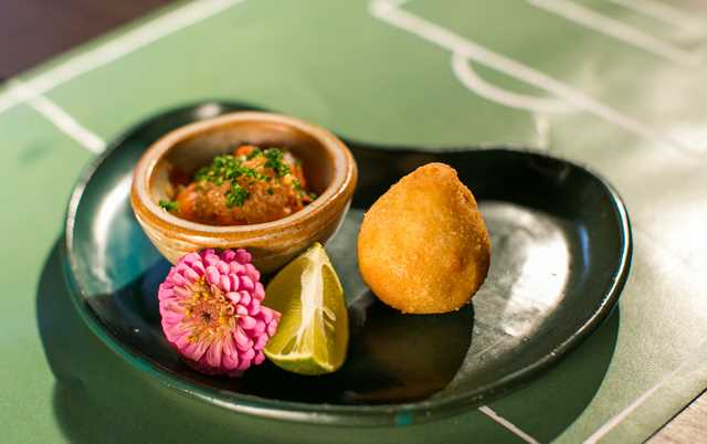| Coxinha de macaxeira recheada de jerimum, charque e catupiry - com uma panelinha de tripa |