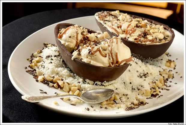 Ovo Red: Ovo de Páscoa feito de puro chocolate belga, recheado com sorvete artesanal de doce de leite e castanha do Brasil ao toque de flor de sal – R$55/kg