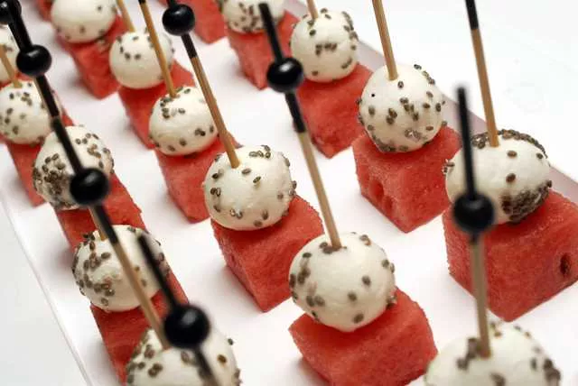 | Squares de melancia com boursin e chia |