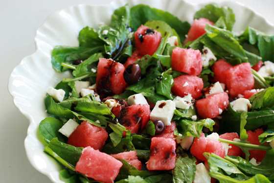 2. Lave as rúculas e tire os caules mais duros. Seque-as bem e disponha num prato grande. Ponha os cubos de melancia por cima, os pedaços de queijo e as azeitonas. Pingue um pouco do vinagre balsâmico reduzido e sirva o restante separadamente. Tempere a salada com flor de sal. Sirva imediatamente.