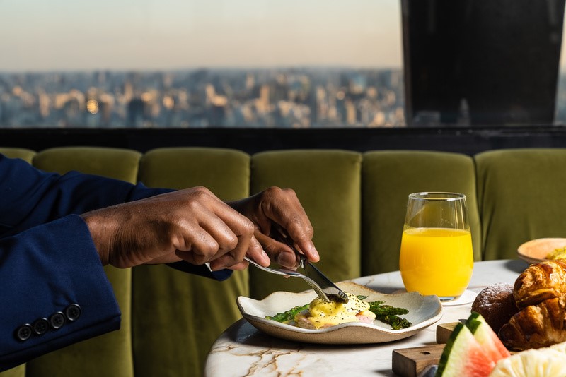 Chegando no Tivoli, o café da manhã dos sonhos fica localizado no 23º andar da Alameda Santos 1437. Com vista privilegiada e atmosfera agradável, os destaques ficam por conta do buffet farto de frutas, cereais, pães, geleias, mix de castanhas, iogurtes, queijos e embutidos.
