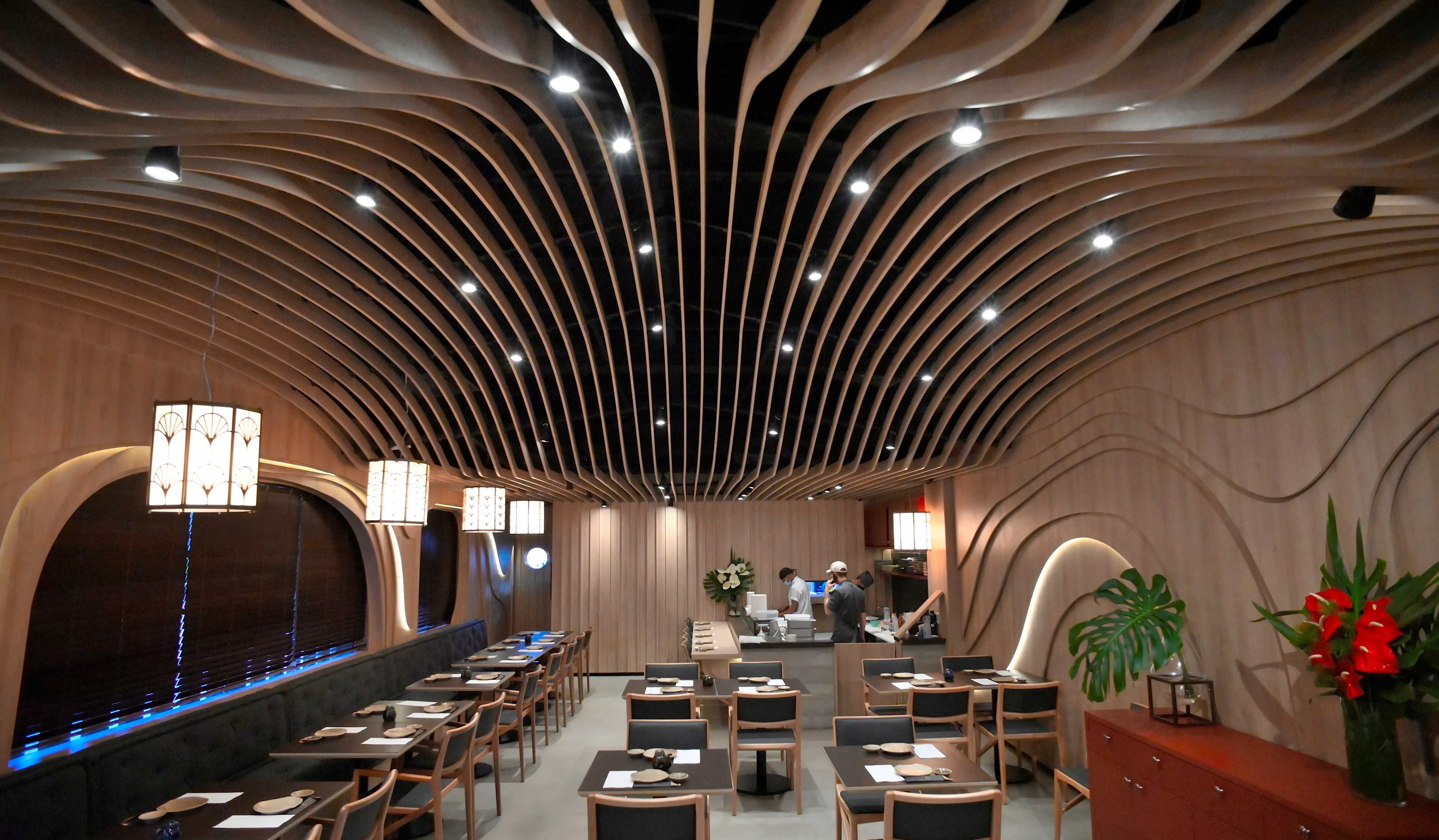 A nova casa do chef Koji Yokomizo chama atenção pelo balcão charmoso com bancos altos na calçada (para espera, quando a casa está com as mesas todas ocupadas) e pelo salão principal que acompanha o teto cheio de design em ondas – os responsáveis pelo projeto inovador são João Vicente Cunha, Manoel Bragheroli e Dominique Nageli.