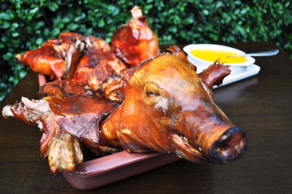 De volta ao prato principal de almoço – O leitão Voador chega inteiro ao salão com as patas para fora da travessa como estivesse voando, seus temperos são sal grosso, um pouco de água no fundo e forno lento. Isso faz com que a carne se desmanche delicadamente.