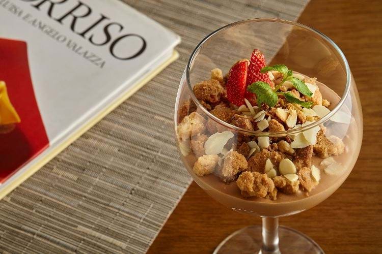E para finalizar o jantar - mousse de chocolate com avelã e crumble de frutas secas ou Sopa de frutas vermelhas com sorvete de iogurte e laranja caramelizada. O valor do jantar é de R$ 125,00 por pessoa.