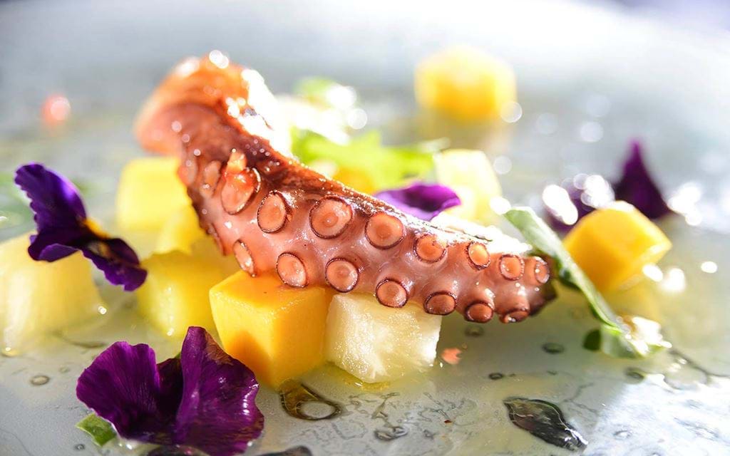 Em seguida partimos para a seleção de Primeiro Prato como: o Polvo grelhado com batata, abacaxi, manga, rúcula e o toque do chef, que nos fez salivar com a fusão sem erro do polvo macio com as frutas tropicais (R$39,00). O Ravioloni de gema, espinafre, ricota na manteiga de escargot e azeite de trufa negra chegou à mesa aromático, macio sobressaindo no paladar (R$46,00).