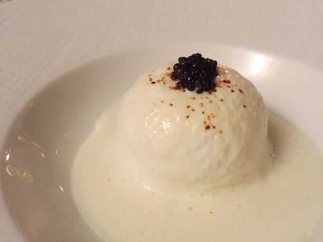 O terceiro - Um belo Ovo perfeito com caviar por cima (no nosso instagram você confere o vídeo). No prato o ovo mais que perfeito, chega com uma espuma branca de creme de leite, onde na hora de parti-lo, a gema mole dá cor ao prato. O Chardonnay da Borgonha - produtor Domaine Pierre Labet, que foi escolhido para fazer dupla. Tem corpo médio, tons de amêndoas tostadas, é mineral e com boa acidez. Passando por carvalho ganha amadurecimento sobre as lias por um ano. Na boca é vibrante, equilibrado e delicioso.
