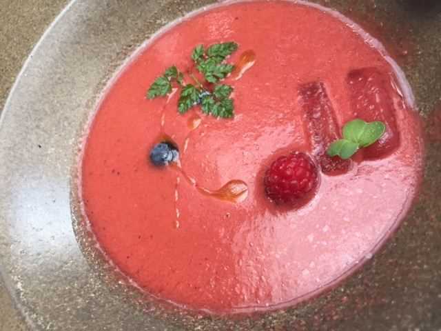 Casa com atmosfera agradável, o restaurante de gastronomia variada trouxe como primeira opção de entrada o Gaspacho de tomate com frutas vermelhas, melancia curada e mini rúcula – foi a entrada que mais surpreendeu pela cor, temperos leves e textura. (R$ 28,00). Outra sugestão foi a Pupunha assada com semente de chia e queijo feta com redução de beterraba e vinagrete de erva-doce – prato equilibrado, simples e na medida certa – um destaque para o sabor do vinagrete de erva-doce (R$33,00). Para harmonizar as entradas de Pupunha e o Gaspacho foi escolhido o espumante brasileiro Vallontano Brut da região do Vale dos Vinhedos. É um blend refrescante e delicado de Pinot Noir e Chardonnay que traz boa acidez e vontade de tomar mais uma taça. (Importadora Mistral).