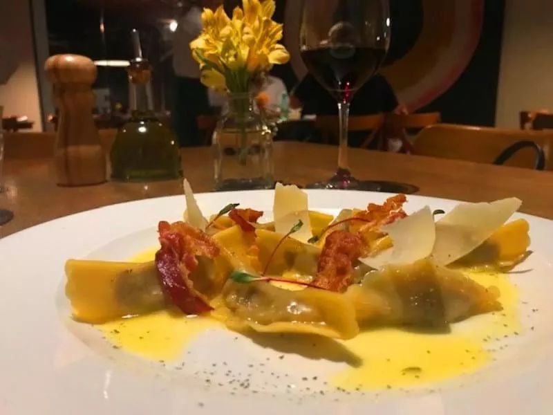 Logo em diante, o primeiro prato com Casoncelli alla Bergamasca – Massa típica de Bérgamo, recheada com carnes, biscoitos amaretti, uvas passas e queijo Grana Padano, na manteiga e sálvia com pancetta crocante. (foi o nosso favorito).