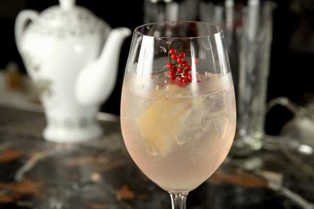 Para servir: coe a bebida em um copo com gelo com um ramo de pimenta rosa.