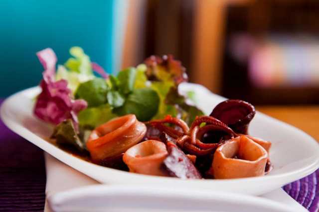 calamares manches lulas e beterrabas assadas e salteadas com limão, laranja e toque de chile habanero; com folhas verdes; prato emblemático do chef mexicano benito molina. 33,00