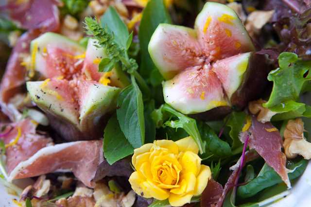 | A apetitosa salada com nozes, jamón e figos frescos |
