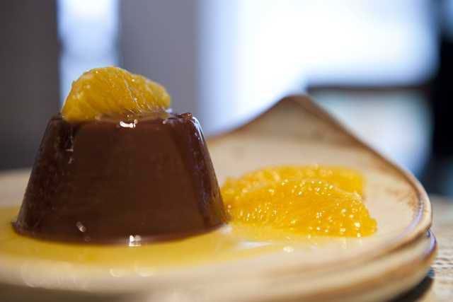 Em uma tigela pequena, coloque as folhas de gelatina de molho em água fria. Reserve. Em uma panela pequena, leve o creme de leite ao fogo até aquecer, junto com o leite, o açúcar e o gengibre. Tire do fogo e deixe descansar por 10 minutos, tampado. Passe o creme por uma peneira fina (ou chinois), apertando para extrair bem o aroma do gengibre. Volte-o à panela, junte o chocolate em pó e reaqueça, mexendo bem para dissolver o chocolate e obter um creme homogêneo. Tire do fogo e junte as folhas de gelatina espremidas, mexendo bem para dissolvê-las. Coloque o creme em tigelinhas ( previamente molhadas com água) e leve-as à geladeira por no mínimo 5 horas. Para preparar o coulis (a calda), leve ao fogo o suco de laranja e o açúcar. Deixe ferver até engrossar. Junte os gomos de laranja e sirva sobre a panna cotta.