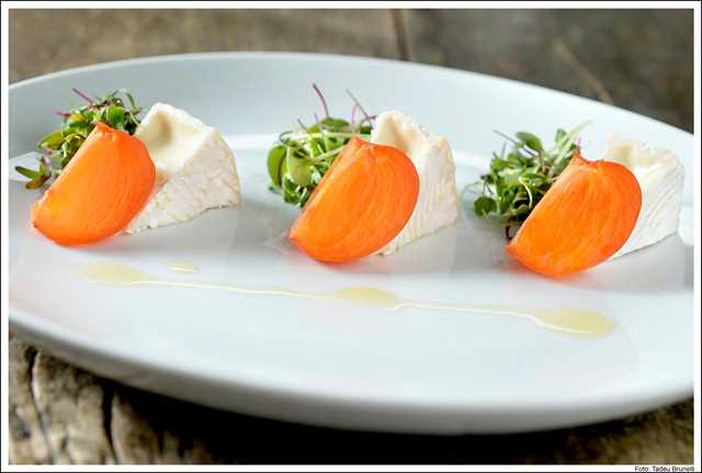 4 – Em um prato, disponha o mix de brotos de folhas verdes em três montinhos. À frente de cada um, coloque um triângulo de Camembert e um gomo de caqui.