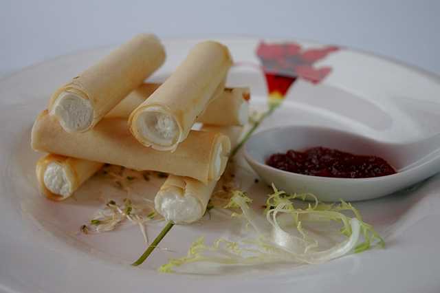 | A inusitada entrada de Mini rolls de queijo de cabra da casa |