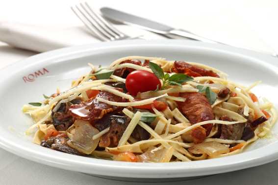 Prato principal: Fettuccine alla Burguesa (Massa tipo fettuccine, bacon, berinjela, presunto Parma crocante, queijo provolone, azeite italiano extra-virgem DOP e tomate sem pele e sem sementes).