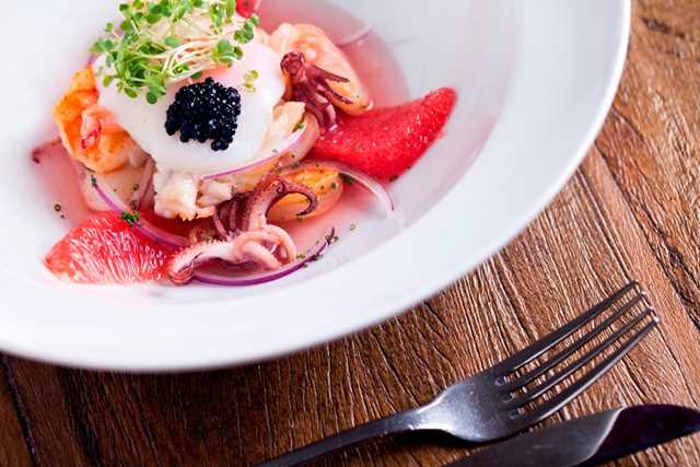 vinho branco, aperol, grapefruit, ovo poché e caviar de Mujol espanhol – R$39,00.