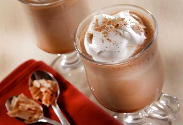 Leve os copos à mesa e cubra com chantilly. Polvilhe o chocolate temperado com pimenta e mexa o machiatto. Beba-o em seguida, ainda quente.