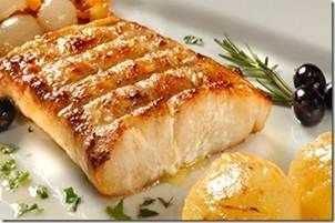Lombo de salmão grelhado na churrasqueira. Guarnecido de arroz branco, batata assada e brócolis – R$ 68,00.