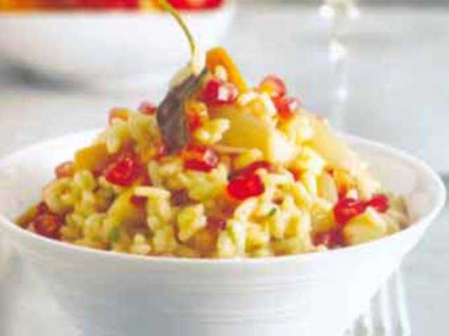 Esprema uma das romãs para extrair o suco e retire as sementes da outra. Quando o arroz estiver cozido, junte o suco, as sementes de romã e bom apetite!