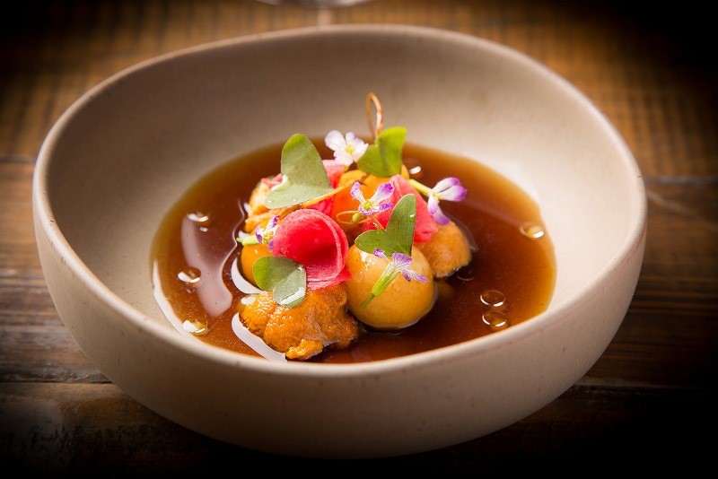 Um exemplo que se pode encontrar no jardim do Maní é a entrada fresca que traz cor, sabor e texturas – É o Nabo | Cebola | Ouriço. (na companhia refrescante do chileno Viña Aquitania Chardonnay 2013).