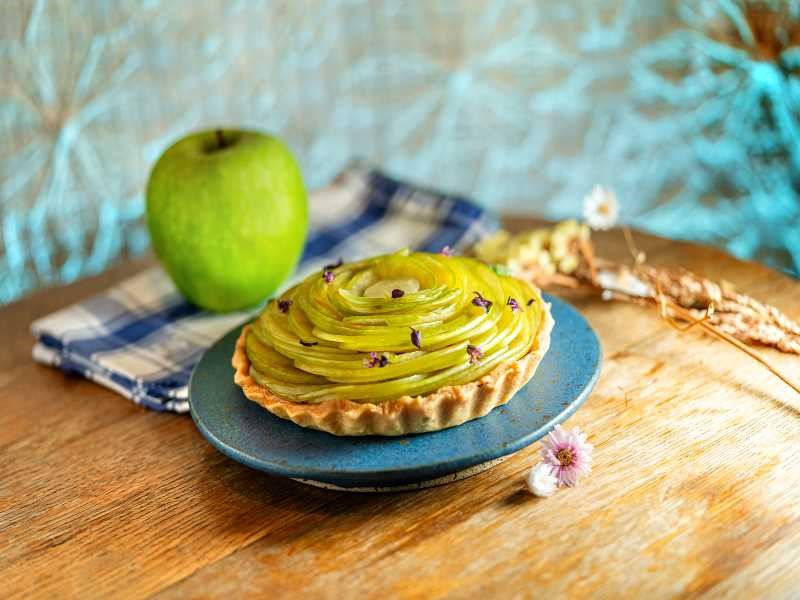 - Com a massa já desenformada, comece a montagem. Coloque a compota de maçã sobre a massa, e, aos poucos, vá adicionando as fatias de maçãs uma do lado da outra, sobrepondo-as.