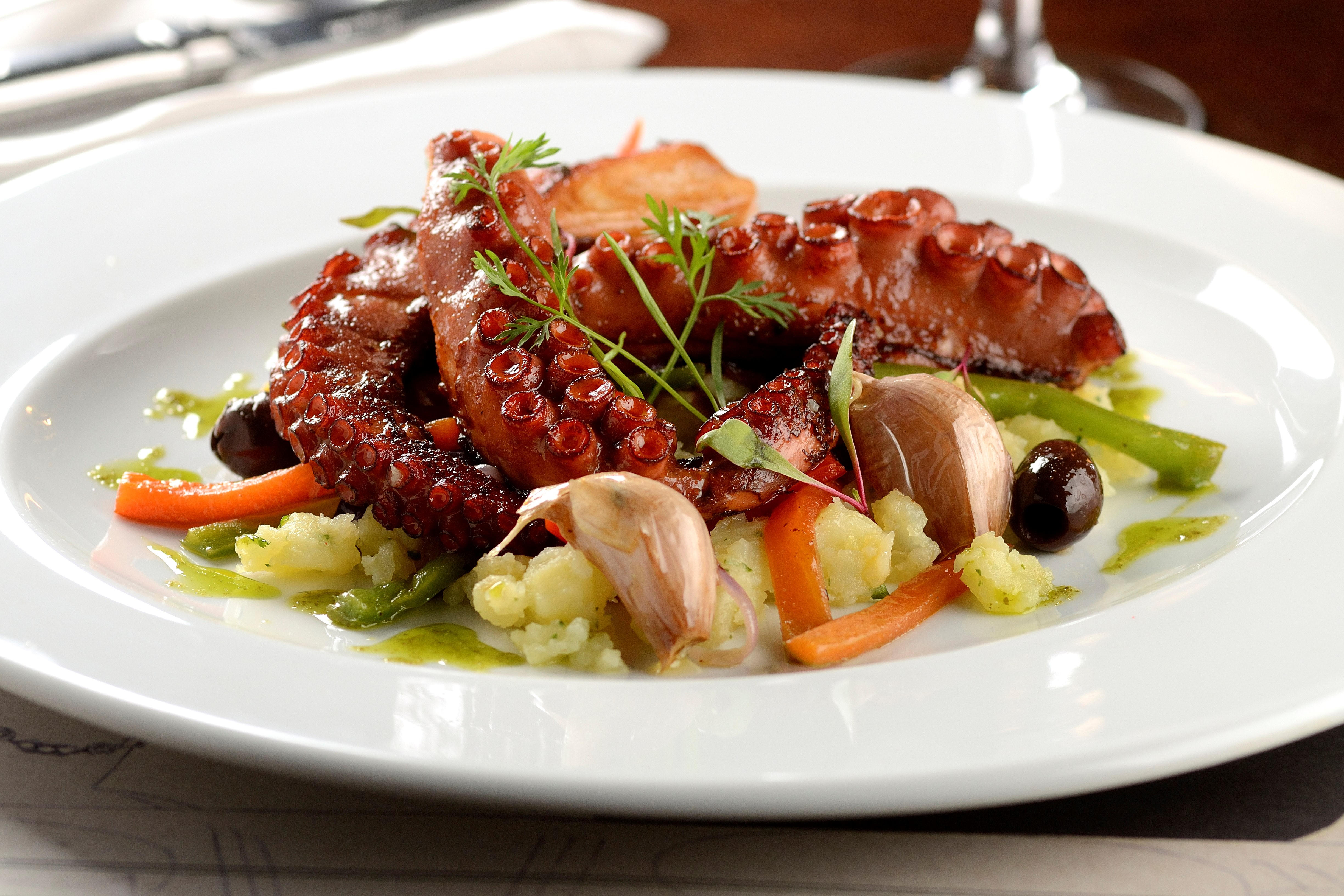 Modo de preparo: Cozinhe o polvo na água com sal por 45 minutos e verifique o ponto de cocção em função do tamanho. Reserve e separe os tentáculos. Em seguida, corte em lâminas os pimentões e a cebola. Depois cozinhe as batatas com pele e reserve. Tire a pele das batatas e amasse no garfo, tempere com sal, salsinha picada e azeite. Corte os tomates e dispense as sementes. Salteie no azeite os pimentões e a cebola, tempere com sal e adicione os tomates, azeitonas e dentes de alho. Por fim, salteie no azeite o polvo temperado com páprica defumada e sal até deixar dourado e bem quente por dentro. Num prato, disponha a batata, por cima os legumes e termine pelos tentáculos de polvo.