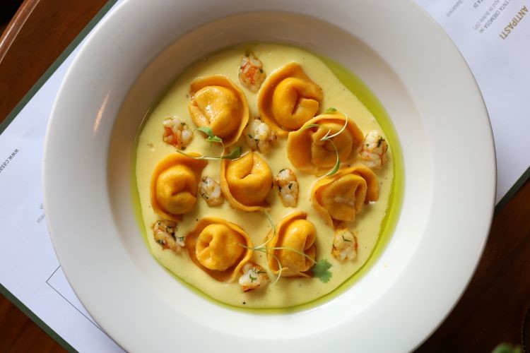 Na sequência, temos o Tortellini Di Gamberi - massa fresca recheada de camarão, acompanhada por mousseline de mandioquinha e camarões salteados. Harmoniza com o Rosé espanhol Orube 2021, de Rioja.