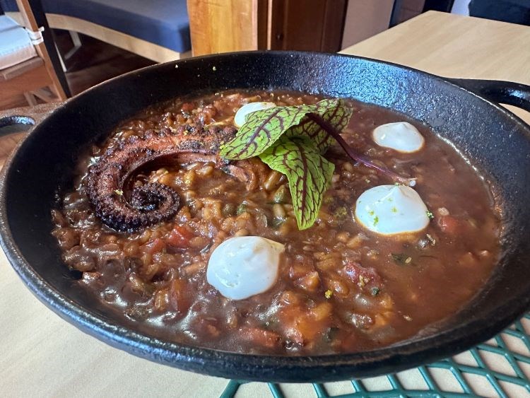 Comece com a entrada Maion (pinxto de polvo e vegetais), ou pela mini salada com folhas, mozarela de búfala e molho de mostarda. Para principal, as homenagens começam com Bença (Arroz caldoso de Cupim), Bá (Moqueca Negra com frutos do mar) ou o Favoritto (Arroz de polvo), que nunca sai do cardápio, por ser o queridinho dos començais. É cremoso com pedaços de polvo tenros e macios em tempero equilibrado. A caçarola de ferro chega quente, aromática e bem servida.