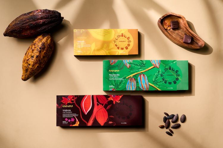Além disso, a parceria com a estilista Flávia Aranha traz uma linha exclusiva de produtos, como barras de chocolate embaladas em tecido sustentável, tingido com corantes naturais, agregando sofisticação e um significado especial ao presente.