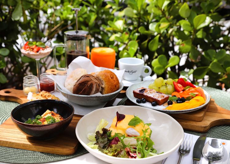 O menu combina elementos do café da manhã com toques do almoço, respeitando a tradição da casa em unir conforto e sofisticação. Entre as opções servidas, estão mini pães sortidos com queijo coalho grelhado, requeijão, manteiga e geleia artesanal; tapiocas rendadas com queijo coalho; e uma versão refinada do Egg Benedict, com salmão defumado, english muffin, molho hollandaise e mini salada.
