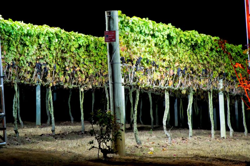 Muito mais que um jantar, a Colheita ao Luar é uma verdadeira imersão nos sentidos. A noite começa com antepastos e espumantes entre os parreirais, seguidos por uma visita guiada com o enólogo da casa, que revela curiosidades sobre o terroir, a técnica da dupla poda e a qualidade das uvas colhidas no inverno.