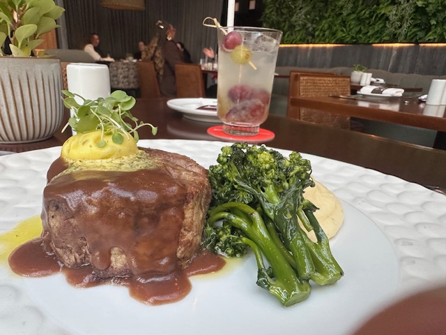 Para esse almoço escolhemos pratos do A la carte e iniciamos com um drink não alcoólico elaborado pela bartender Adriana Pino, intitulado de Honney Moon (uvas maceradas, xarope de mel, limão Tahiti e água de coco é delicado e saboroso), de entrada fomos de Crudo de Salmão (avocado, quinoa e azeite trufado serviram de cama para acomodar o salmão levemente maçaricado – muito bom). Já para o principal, aderimos a dica do garçom com o Filé Mignon à Café de Paris. (purê de batata com queijos, brócolis romanesco e manteiga à Café de Paris – É uma receita clássica francesa da região de Bordeaux). O prato equilibrado na cor sabor, cremosidade e suculência. Já a sobremesa, fomos Pudim Tivoli – leve e lisinho. Talvez seja mesmo, o melhor do planeta como está no menu!