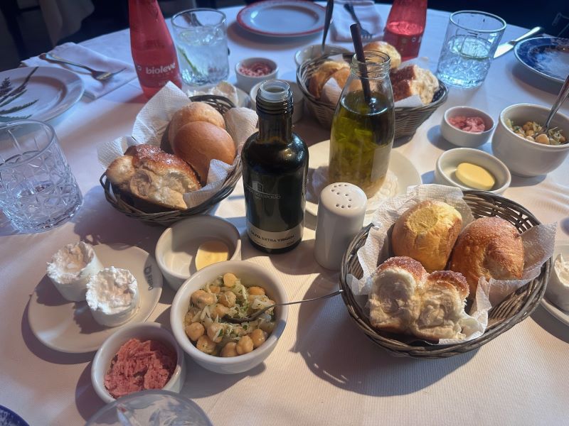 Logo na chegada, a experiência já começa com um couvert irresistível: patês de chouriço português, saladinha de bacalhau com grão-de-bico, pães artesanais, queijo fresco feito na própria casa, manteiga cremosa e os clássicos bolinhos de bacalhau, crocantes por fora e macios por dentro.