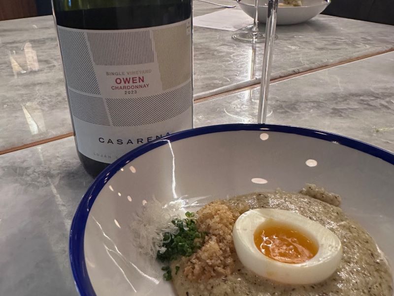 Na sequência, o Casarena Single Vineyard Owen Chardonnay 2022 revelou a elegância dos brancos da casa. Proveniente de uma safra fria, o vinho foi fermentado em barricas de carvalho francês com bâtonnage e amadurecido por seis meses sobre borras finas. Essa técnica conferiu ao Chardonnay textura cremosa, acidez equilibrada e aromas de maçã verde, limão siciliano e leve tostado, com excelente expressão mineral e potencial de guarda. Harmonizou lindamente com a Polentina da casa.
