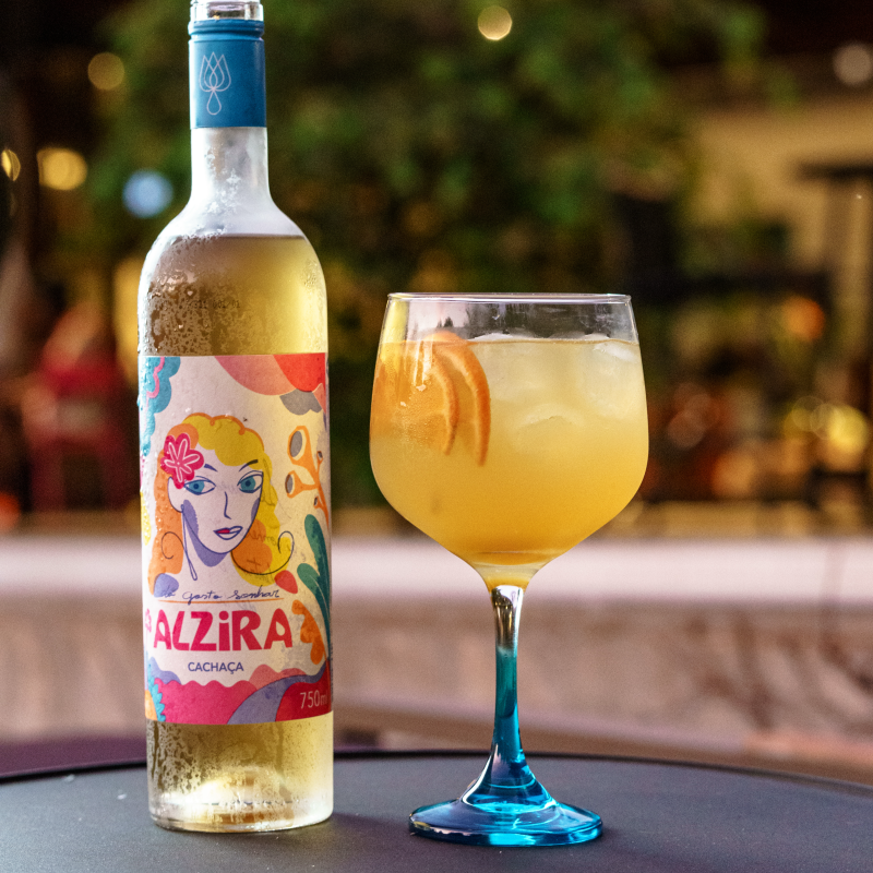 A cachaça ganha leitura leve, cítrica e contemporânea — ideal para acompanhar o pôr do sol ou a volta para casa. Receita: 25 ml de xarope de tangerina, 25 ml de suco de limão Tahiti, 75 ml de Alzira Cachaça PP, 100 ml de Ginger Ale e uma rodela de laranja. Misture os ingredientes na taça com gelo, complete com Ginger Ale e finalize com a rodela de laranja.