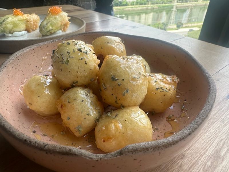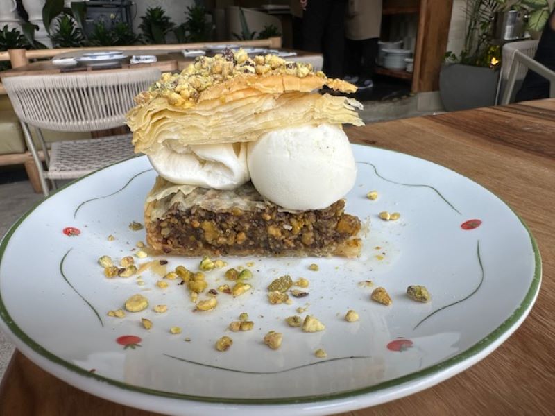 Na visita de almoço, a experiência começou com a entrada italiana Fiori di Zucca com caviar, delicada e fotogênica, seguida pelo toque grego do Feta Popcorn (saganaki) — queijo empanado que ganha contraste irresistível com o mel. O frescor seguiu no prato principal: Spaghetti al Limone e Gamberi, massa fresca que celebra a simplicidade e a delicadeza do limão siciliano. Para encerrar, a sobremesa trouxe o Mediterrâneo em sua forma mais doce: Baklava, torta de massa folhada com pistache e calda de flor de laranjeira, acompanhada de sorvete de iogurte.